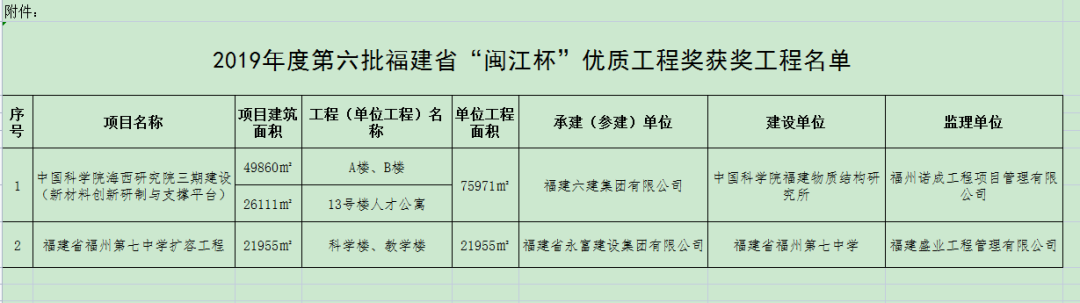 附件:2019年度第六批福建省“閩江杯”優質工程獎獲獎工程名單: